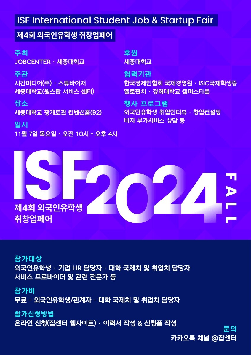 정부의 외국인 유학생 국내 취업 유도 정책에 따라, 세종대는 잡센터와 함께 지난해부터 3회에 걸쳐 ISF를 개최했다. 주요 참여 기업으로는 조선호텔, 안다즈 서울강남호텔, 파크하얏트서울, 페어몬트 여의도 호텔 등 100여 개가 있으며, 1,500명 이상의 외국인 유학생이 참가해 많은 외국인 유학생들이 취업에 성공했다. 최근에는 한화와 효성 등 대기업의 참가가 확대되고 글로벌 스타트업 창업 문의도 증가하고 있다.