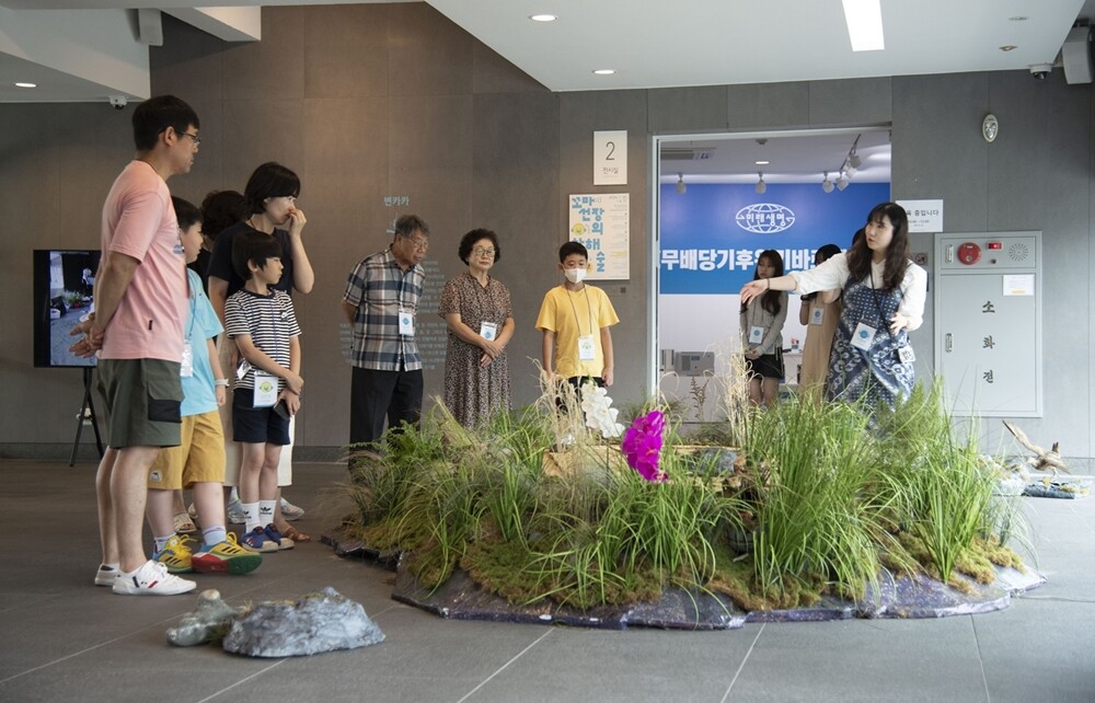 '우리라는 이름의 바다' 전시장에서 프로그램 참여자들이 전시설명을 듣고 있다. 사진=경북대 제공 |