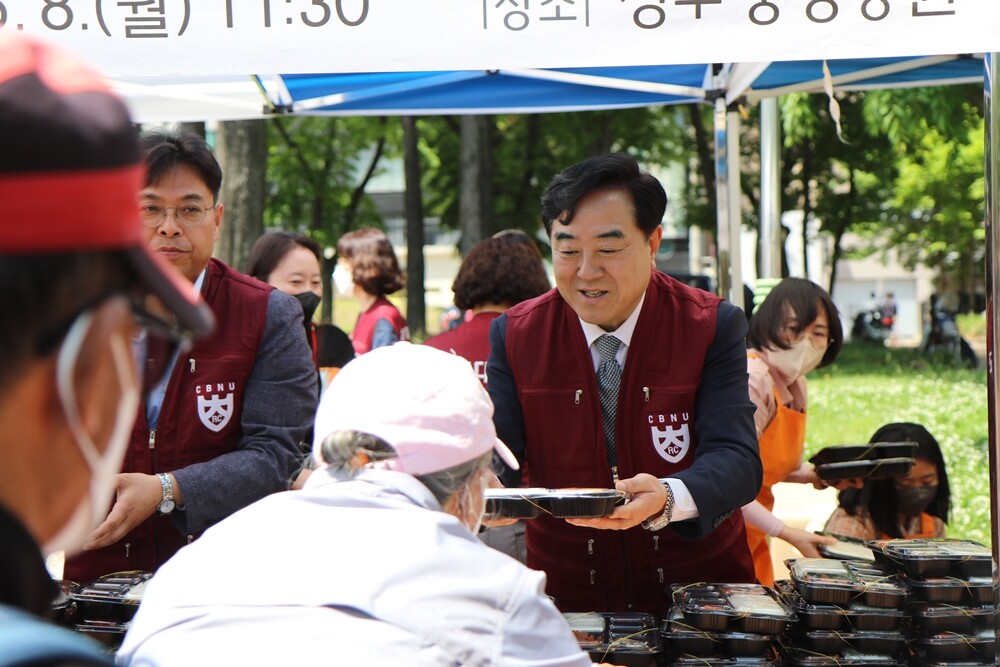 고창섭 충북대 총장을 비롯한 간부진, 교직원 등 60여 명이 지역 어르신 400여 명을 대상으로 점심 도시락 및 음료를 제공해 따뜻한 밥 한끼의 정을 나눴다.