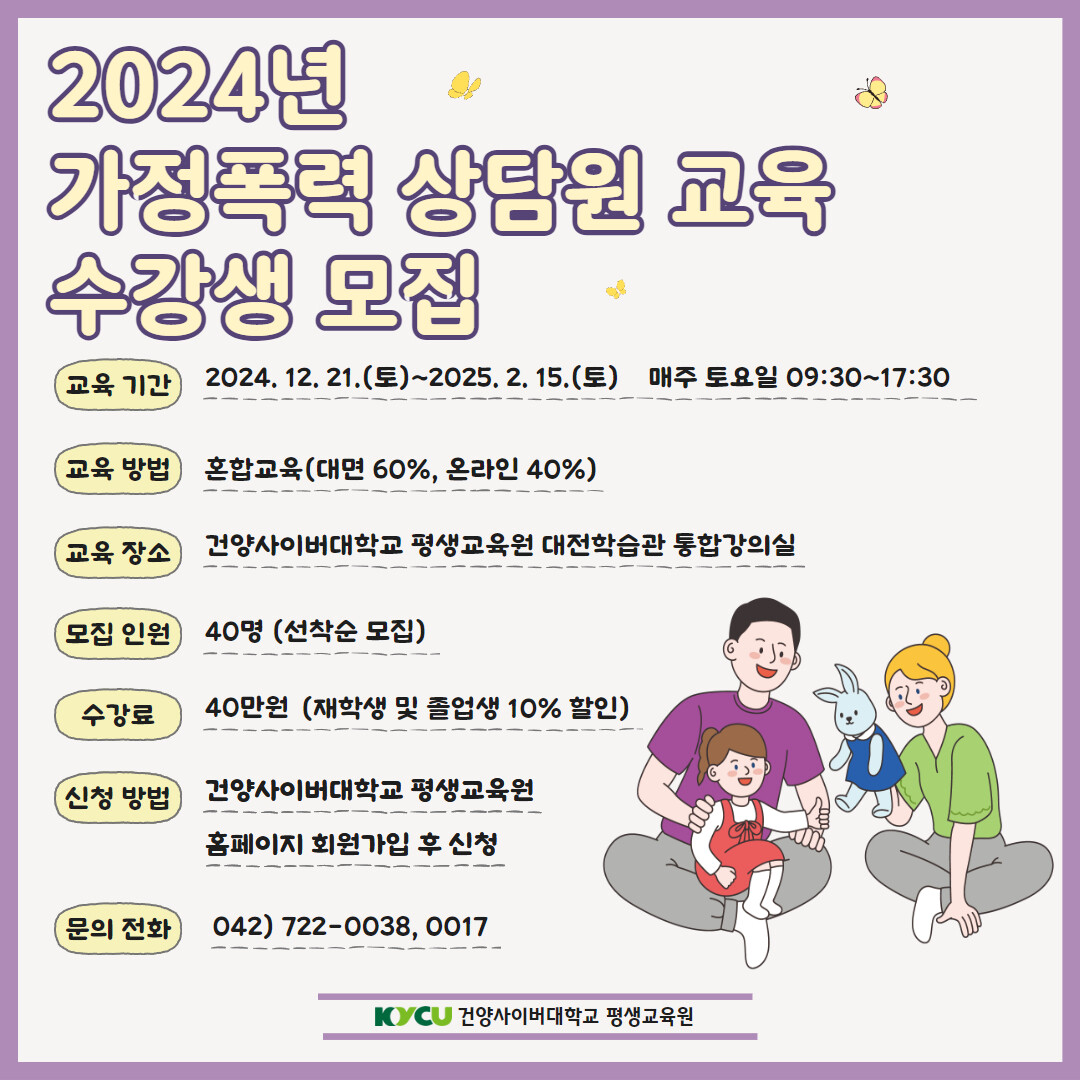 [대학저널 온종림 기자] 건양사이버대학교 평생교육원이 19일까지 가정폭력 상담원 양성 교육 수강생을 모집한다. 가정폭력 상담원 양성 교육은 ‘가정폭력방지 및 피해자보호 등에 관한 법률’ 제8조의3 같은 법 시행규칙 제11조에 따라 가정폭력상담소와 가정폭력피해자 보호시설 등에서 가정폭력피해자를 위한 상담 및 보호 지원 업무를 하는 상담원으로 종사하는 데 필요한 교육이다.