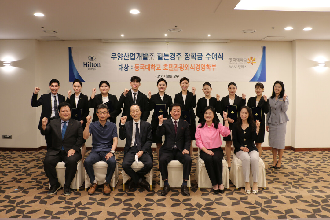 [대학저널 조영훈 기자] 동국대학교 WISE캠퍼스는 2023년 상반기 우양산업개발 힐튼경주 장학금 수여식을 했다고 21일 밝혔다.