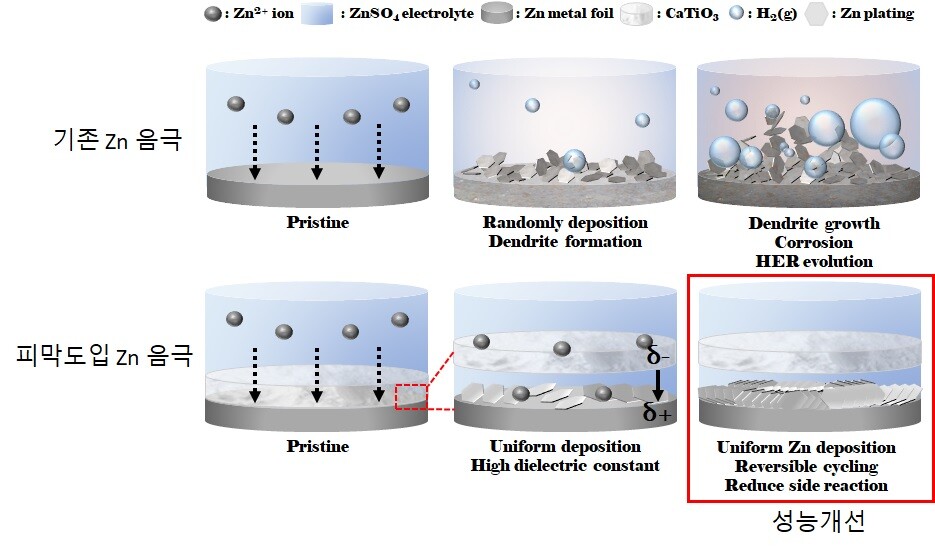 연구팀은 수계아연 이차전지의 고질적인 문제로 알려진 충방전 과정에서의 아연 음극 위 덴드라이트 형성 (배터리 음극 표면에 생기는 나뭇가지 모양의 결정체)과 수소 기체 발생, 수계 전해질 내부에서의 부식 문제를 해결하기 위해 아연 금속 표면에 티타산칼슘(CaTiO₃) 나노입자들을 코팅했다.