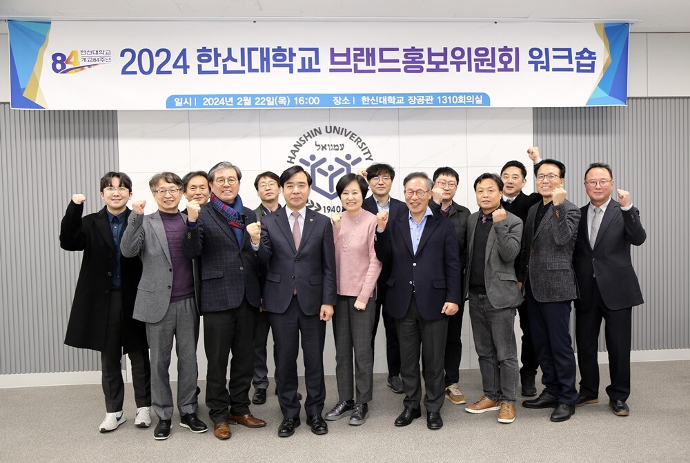 ‘2024 한신대학교 브랜드홍보위원회 워크숍’에 참여한 관계자들이 단체 사진을 찍고 있다. 사진=한신대 제공 |