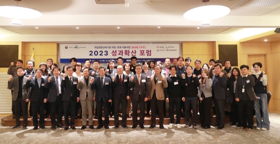 2023학년도 직업전환교육기관 지정·운영 시범사업(HiVE 2유형) 성과 포럼 모습. 맨 앞줄 왼쪽에서 7번째가 김기영 충청남도 행정부지사, 6번째가 김용찬 충남도립대 총장, 8번째가 육근열 연암대 총장. 사진-연암대 제공 |