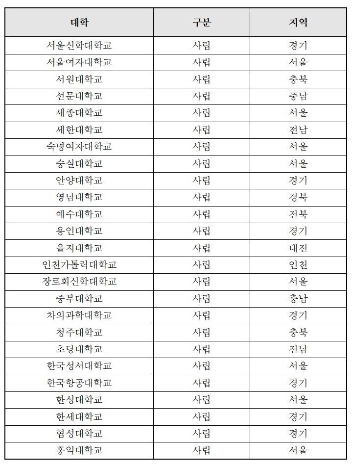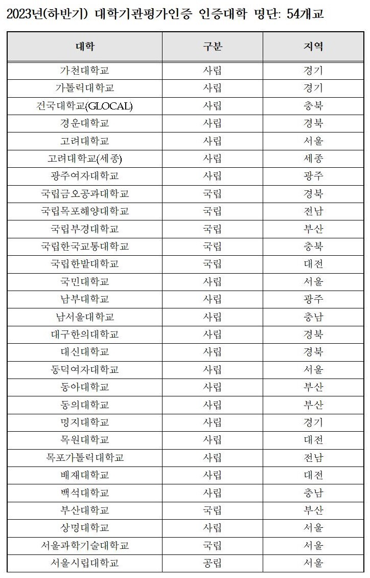 이번에 인증(조건부인증)을 받은 대학(가나다순)은 ▲가천대학교 ▲가톨릭대학교 ▲건국대학교(GLOCAL) ▲고려대학교 ▲고려대학교(세종) ▲광주여자대학교 ▲국립금오공과대학교 ▲국립목포해양대학교 ▲국립부경대학교 ▲국립한국교통대학교 ▲국립한밭대학교 ▲국민대학교 ▲남부대학교 ▲남서울대학교 ▲대구한의대학교 ▲대신대학교 ▲동덕여자대학교 ▲동아대학교 ▲동의대학교 ▲명지대학교 ▲목원대학교 ▲목포가톨릭대학교 ▲배재대학교 ▲백석대학교 ▲부산대학교 ▲상명대학교 ▲서울과학기술대학교 ▲서울시립대학교 ▲서울신학대학교 ▲서울여자대학교 ▲서원대학교 ▲선문대학교 ▲세종대학교 ▲세한대학교 ▲숙명여자대학교 ▲숭실대학교 ▲안양대학교 ▲영남대학교 ▲예수대학교 ▲용인대학교 ▲을지대학교 ▲인천가톨릭대학교 ▲장로회신대학교 ▲중부대학교 ▲차의과학대학교 ▲청주대학교 ▲초당대학교 ▲한국성서대학교 ▲한국항공대학교 ▲한성대학교 ▲한세대학교 ▲협성대학교 ▲홍익대학교 등이다.