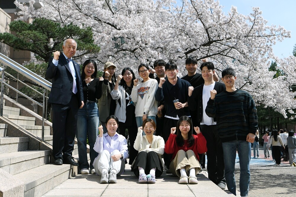 국민대 김형진 교학부총장과 제지공정·환경분석연구실 학생들이 벚꽃길에서 기념사진을 촬영했다. 사진=국민대 제공 |