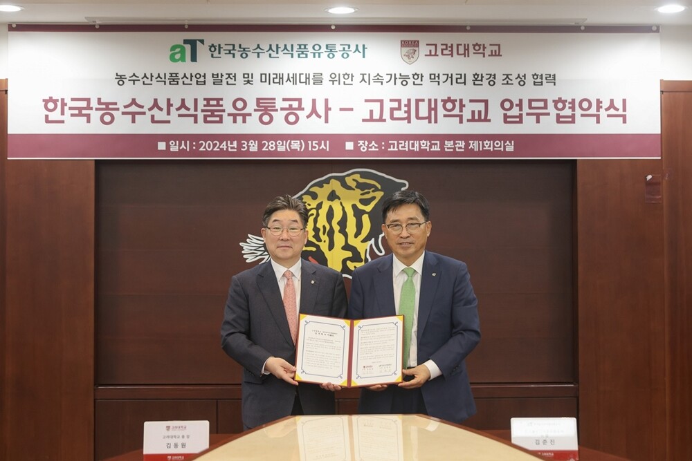 [대학저널 온종림 기자] 고려대학교가 한국농수산식품유통공사와 28일 고려대 본관 제1회의실에서 지속 가능한 먹거리 환경 조성 협력 강화를 위한 업무 협약을 체결했다.