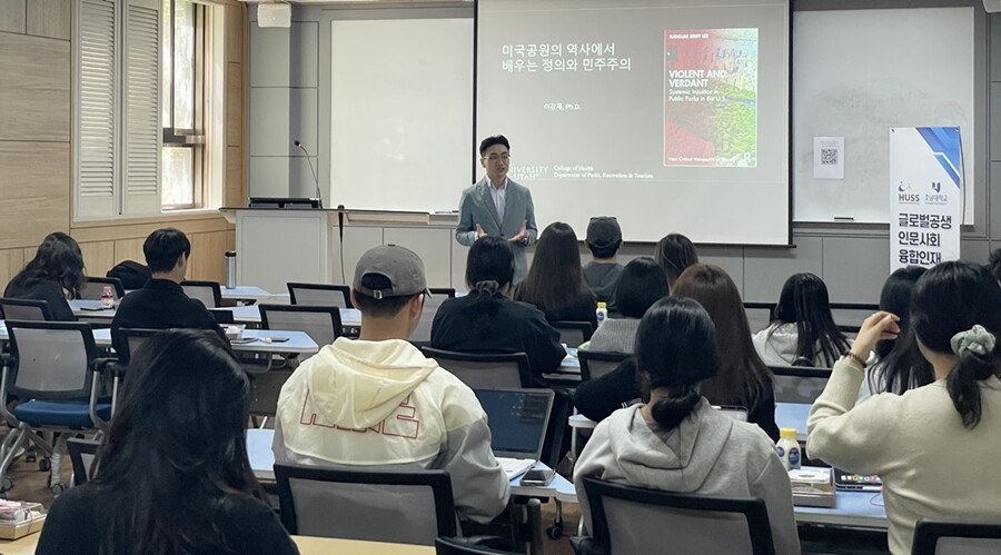 [대학저널 온종림 기자] 호남대학교 글로벌공생 인문사회융합인재양성사업단(HUSS)이 7일 상하관 4107호에서 미국 유타대학교 이강재 교수를 초청, ‘글로벌 스피커즈 프로그램’의 일환으로 ‘미국 공원의 역사에서 배우는 정의와 민주주의’를 주제로 특강을 개최했다.