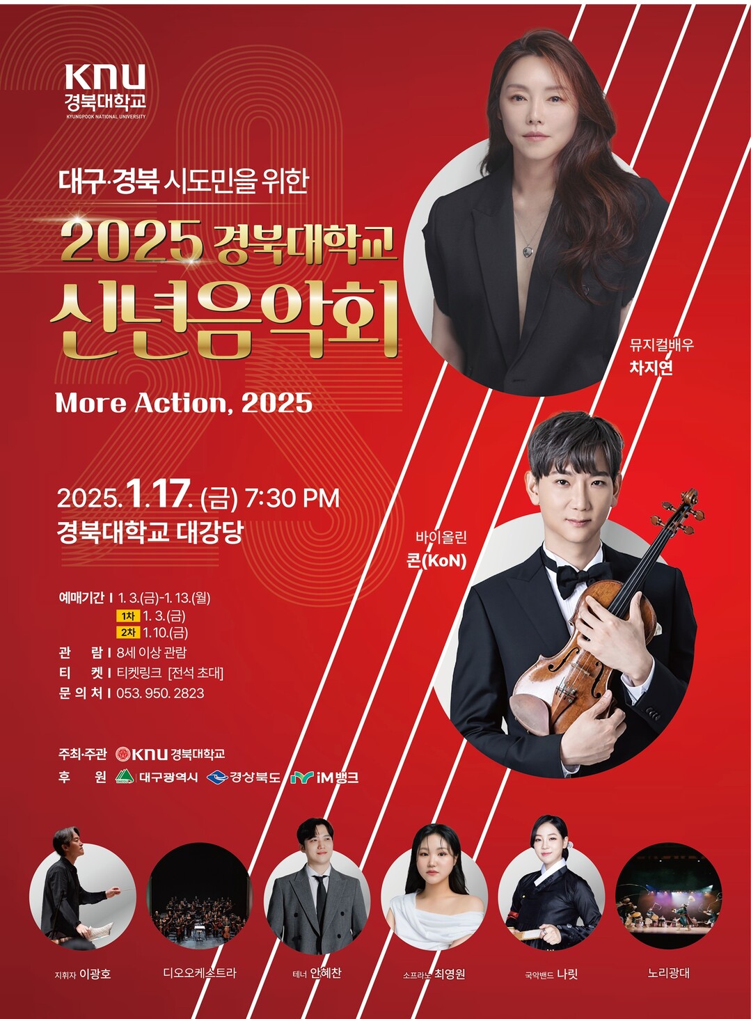 ‘More Action, 2025’를 주제로 열리는 이번 신년음악회는 국내 정상급 뮤지컬 배우인 차지연을 비롯해 바이올리니스트 콘(KoN), 테너 안혜찬, 소프라노 최영원, 국악밴드 나릿, 노리광대 등 다양한 아티스트들이 출연한다. 지휘는 이광호 지휘자가 맡으며, 연주는 오페라 전문 연주 단체인 디오 오케스트라가 함께한다.