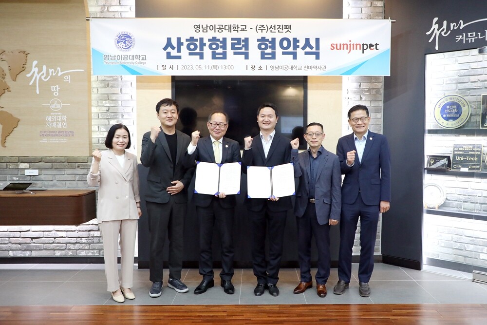 이재용(왼쪽에서 세번 째) 영남이공대 총장과 이권형( ″ 네번 째) 선진펫 대표 등 양측 관계자들이 11일 산학협력 협약을 체결한 후 파이팅을 외치고 있다. 사진=영남이공대 제공 |