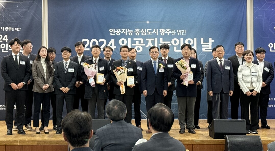 전남대 배정환 교수(앞줄 왼쪽에서 다섯 번째)가 6일 ‘인공지능인의 날’ 행사에서 광주광역시장 표창을 받았다. 사진=전남대 제공 |