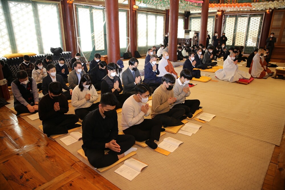 법회에는 건학위원장 돈관스님과 윤성이 동국대 총장, 곽채기 교무부총장, 정각원장 진명스님과 대학 관계자들이 참석했다. 학생 대표들과 건학위 ‘지역 미래불자 육성장학’ 학생들도 함께 참석해 학생의 완쾌를 기원했다.