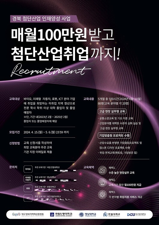신청기간은 4월 15일부터 5월 6일까지이며, 지원자는 교육신청서를 작성해 국립안동대 ‘경북 바이오 첨단산업 인재양성 사업단’ 이메일로 접수하면 된다. 보다 자세한 사항은 전화로도 문의가 가능하다.