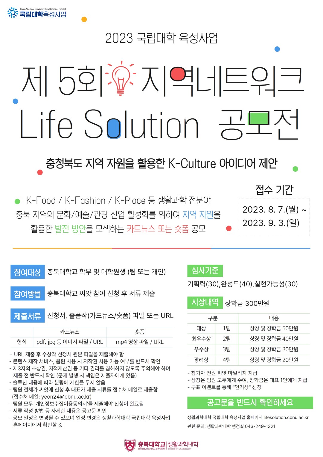 공모는 K-Food, K-Fashion, K-Place 등 생활과학 전 분야와 관련된 충북 지역의 문화·예술·관광 산업 활성화를 위해 지역 자원을 활용한 발전 방안을 모색하는 내용의 카드뉴스 또는 숏폼 형식으로 제출하면 된다.