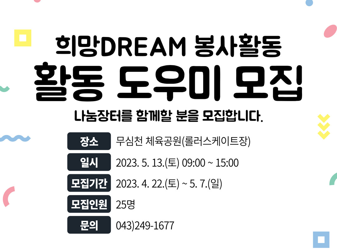 봉사활동 일시는 5월 13일이며, 오전 9시부터 오루 3시까지 무심천 체육공원(롤러스케이트장)에서 진행한다. 주요 활동 내용으로는 체험 부스 운영, 행사 진행 보조, 행사장 내 안전요원 활동 등이 있다.