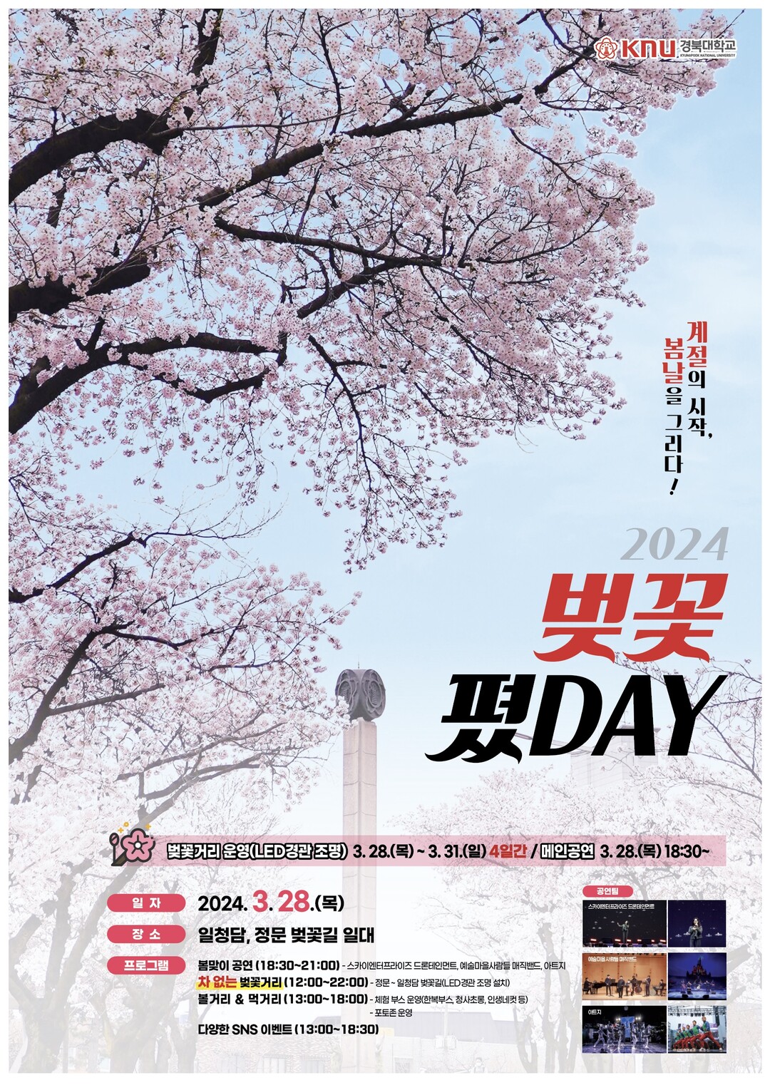 경북대는 3월 28일 대구캠퍼스 일청담 일대에서 지역민과 함께하는 제2회 ‘벚꽃 폈DAY’를 개최한다. 일청담 일대 벚꽃길 구간을 ‘차 없는 벚꽃거리’로 조성하고, 이를 배경으로 공연과 체험, 이벤트 등 다양한 볼거리와 즐길거리를 제공한다.