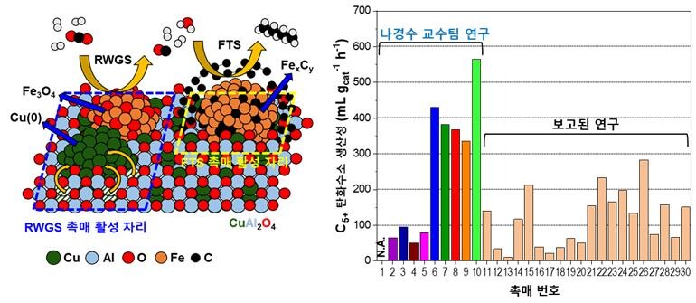 연구팀은 선행 연구를 통해 이 구리-알루미늄 기반의 금속 산화물이 이산화탄소의 수소화 반응에서 일산화탄소를 높은 수율로 생산하는 것을 밝혔다. 그리고 이러한 특징을 이용해 일산화탄소를 전환해 탄화수소를 생산하는데 활성이 있다고 알려진 철계 촉매를 구리-알루미늄 기반의 금속 산화물에 주입한 신규 촉매를 개발했다.