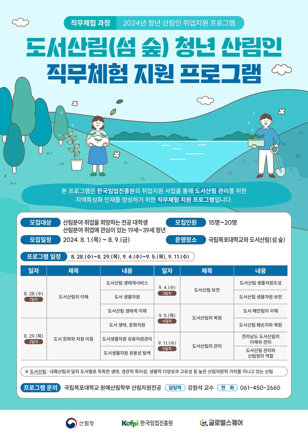 도서산림 청년 산림인 취업지원 프로그램은 산림분야 취업을 희망하는 전공 대학생 및 취업에 관심이 있는 19∼39세 청년들을 대상으로 15~20명을 모집하여 진행된다. 도서산림은 내륙산림과 달리 도서별로 독특한 생태, 경관적 특이성, 생물적 다양성과 고유성 등 높은 산림자원적 가치를 지니고 있는 산림을 뜻한다. 본 프로그램은 도서산림 관리를 위한 지역특성화 인재양성을 목적으로 진행된다.