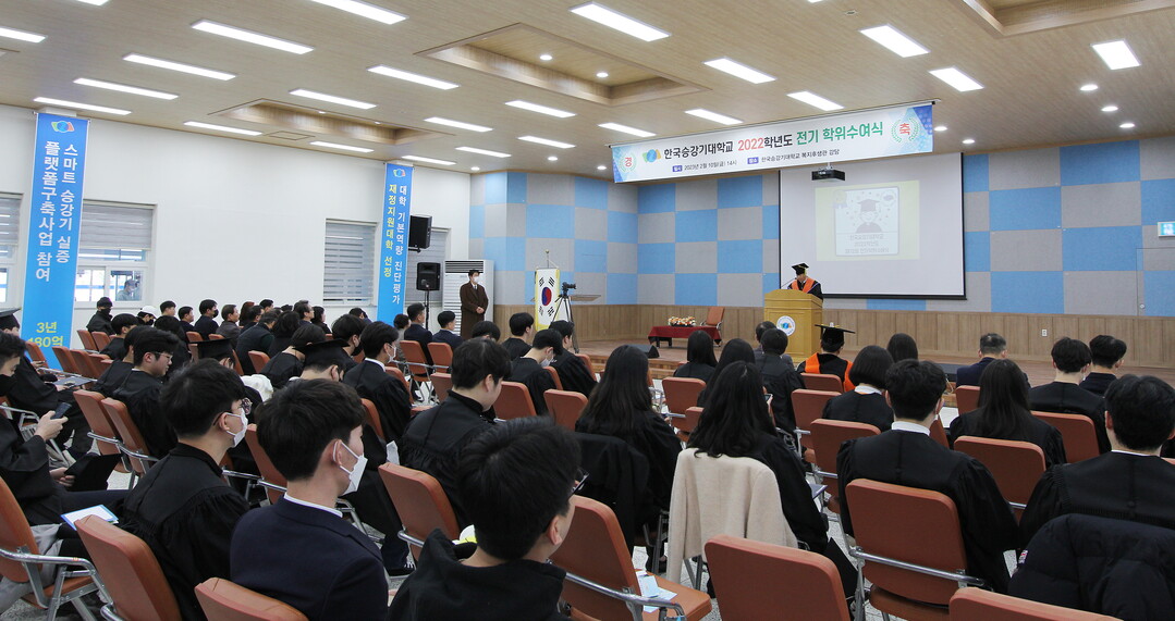 | 10일 한국승강기대 전기 학위수여식에서 졸업생들이 김승호 총장 직무대행의 축사를 듣고 있다. 사진=한국승강기대 제공 |