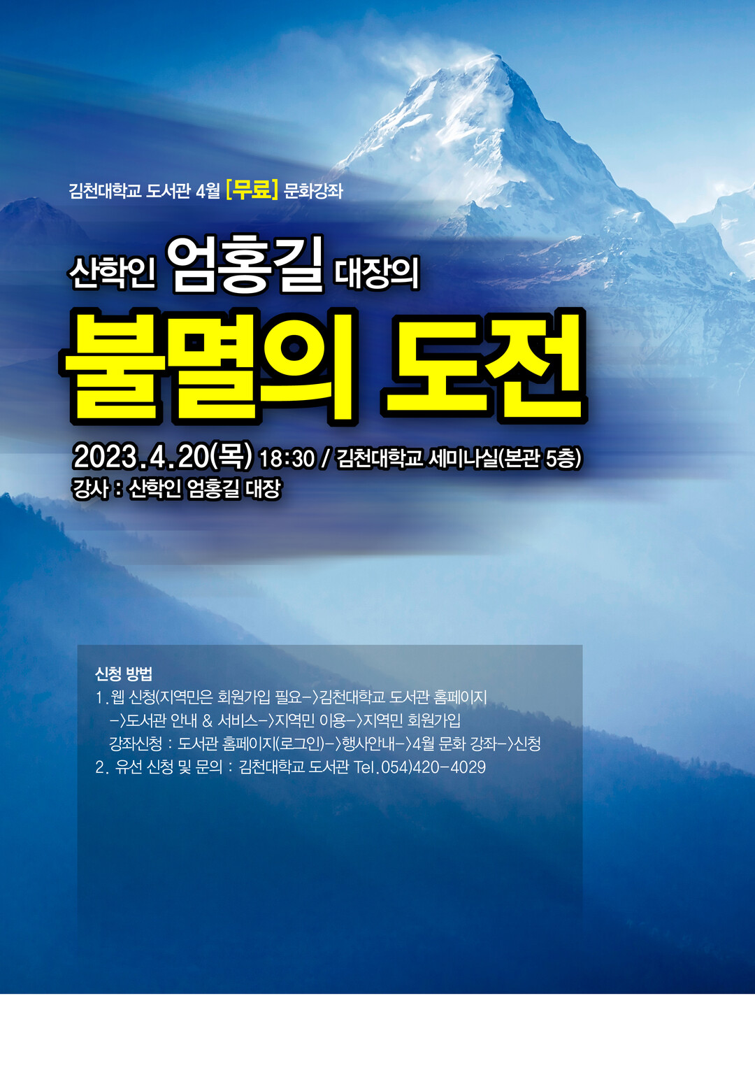 4월 문화 강좌는 김천대 본관 5층 세미나실에서 진행된다. 이번 회차에서는 산악인 엄홈길 대장을 초청하여 “불멸의 도전”이라는 주제로 강좌를 진행할 예정이다.