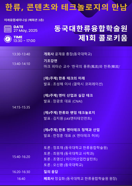 [대학저널 온종림 기자] 동국대학교 한류융합학술원이 오는 27일 오후 1시 30분부터 동국대 혜화관 미래융합세미나실에서 ‘한류, 기술로 만나다’를 주제로 제1회 콜로키움을 개최한다. 이번 콜로키움은 첨단 기술과 한류 콘텐츠를 융합하여 새로운 형태의 한류를 창출하는 현재와 미래를 진단하고, 기술과 콘텐츠를 한류에 결합해 비즈니스 모델을 창출하는 ‘새로움’을 찾아 한류 산업의 지속적인 성장을 이끌 수 있는 해답을 찾기 위해 마련됐다.