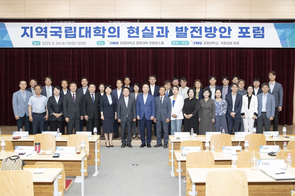 강원대가 24일 주최한 ‘지역국립대학의 현실과 발전방안 포럼’ 참석자들이 포럼이 시작되기 전 포즈를 취하고 있다. 사진=강원대 제공 |