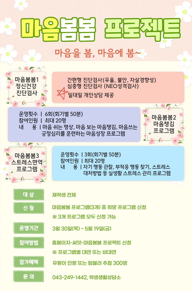 참여 학생들은 3개의 봄봄 프로그램을 선택하거나 모두 참여할 수 있다. 프로그램 운영에 대한 자세한 안내사항과 신청 방법은 충북대 학생생활상담소 홈페이지 내 공지사항에서 확인할 수 있다.