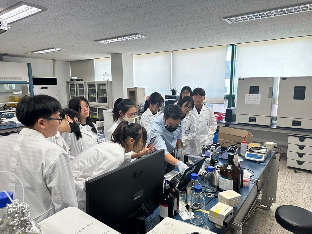 가천대 과학영재교육원 중등과정 학생들이 과학실험을 하고 있다. 사진=가천대 제공 |
