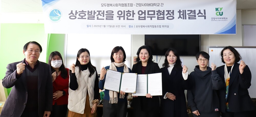 [대학저널 온종림 기자] 건양사이버대학교가 고용노동부 인증 사회적기업인 모두행복사회적협동조합과 17일 대전 중구 유천동에 위치한 조합 회의실에서 양 기관 간 교육 협력을 위한 업무협약을 체결했다.