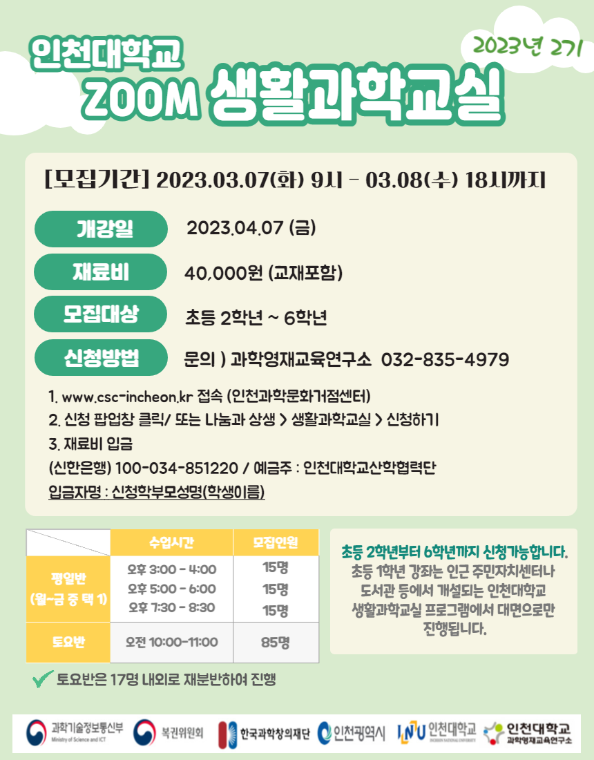 모든 강좌는 실시간 온라인(ZOOM)으로 이뤄지며, 접수는 인천과학문화거점센터 홈페이지를 통해 7일 오전 9시~8일 오후 6시까지 2일간 선착순으로 마감한다.
