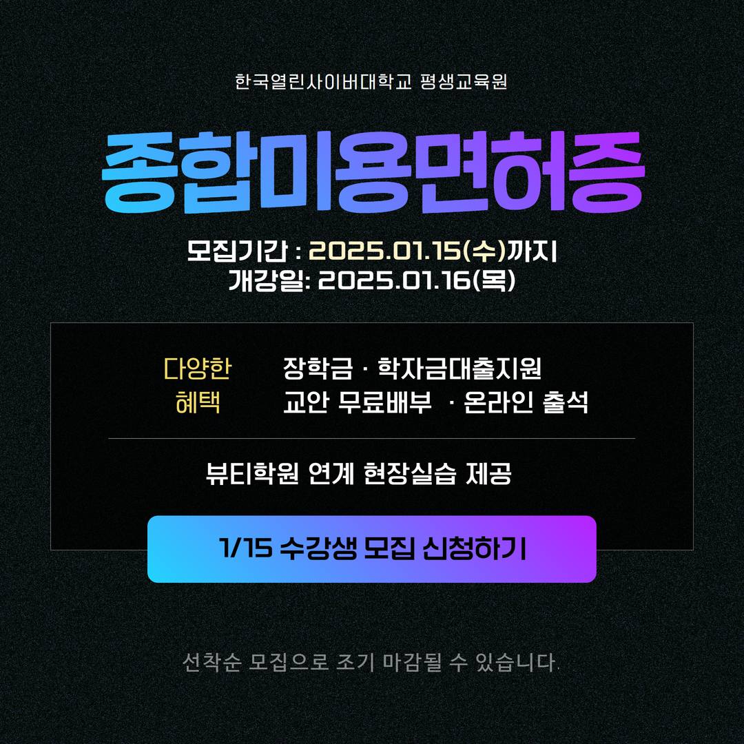 한국열린사이버대학교 평생교육원에서 종합미용면허증 교육과정의 수강생을 금일 15일(수) 저녁까지 선착순으로 모집한다고 밝혔다. 개강일은 1월 16일(목)이다.
