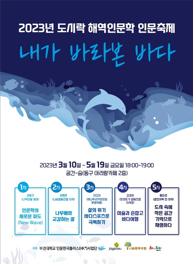 ‘내가 바라본 바다’를 주제로 열리는 축제는 10일 오후 6시 1강을 시작으로 5월 19일까지 5차례에 걸쳐 부산 동구 좌천동 아리랑고개카페 2층 공간-숨에서 인문학 강의를 연다.