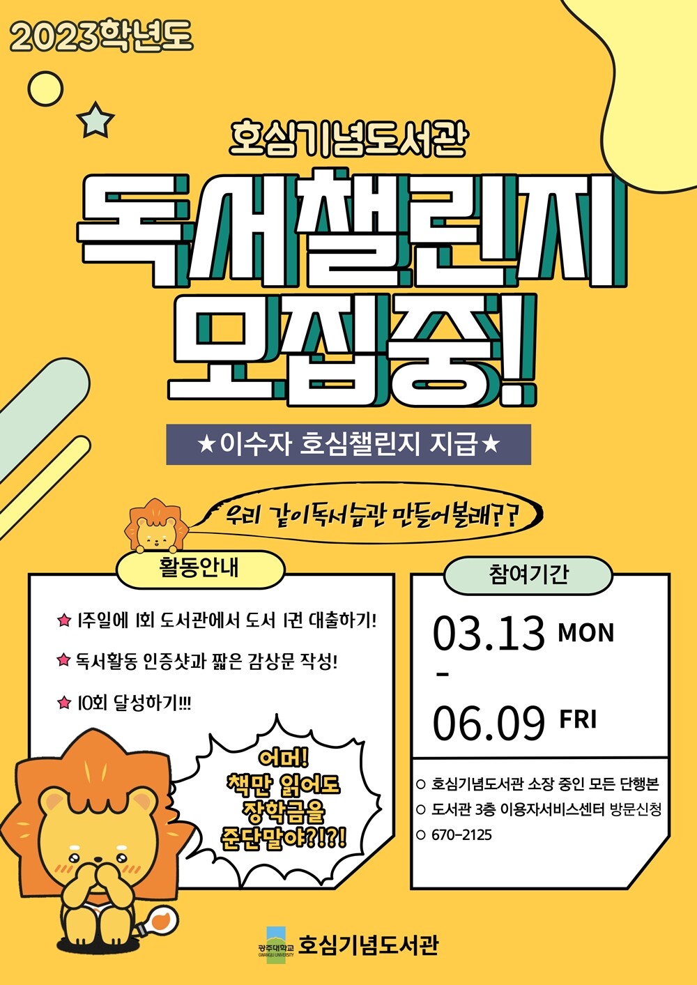 [대학저널 문차영 기자] 광주대학교 호심기념도서관이 독서문화 확산을 위한 독서 이벤트를 진행 중이다.