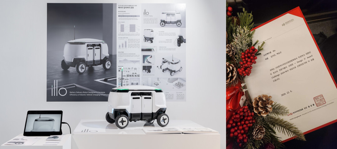김지민, 백승선 학생이 출품한 ‘illo’는 전기차 충전 사각지대를 해소하고 충전 효율성을 극대화하기 위해 개발된 배터리 딜리버리 로봇이다. 이 로봇은 사용자 친화적 설계와 서비스적 접근으로 근거리 전기차 충전 수요를 충족시키는 혁신적인 방안으로 높은 평가를 받아 대상을 수상했다.