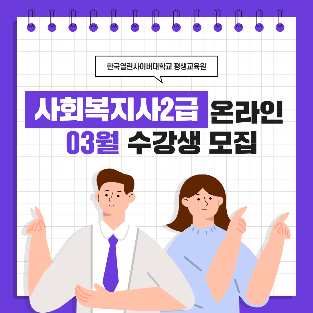 사회복지사2급 교육과정은 자격증 취득을 목적으로 취업과 승진 기회를 얻을 수 있는 과정으로 전문대학 이상의 학력과 필수 17과목 이수를 충족하면 별도의 시험없이 자격증 취득이 가능하다.