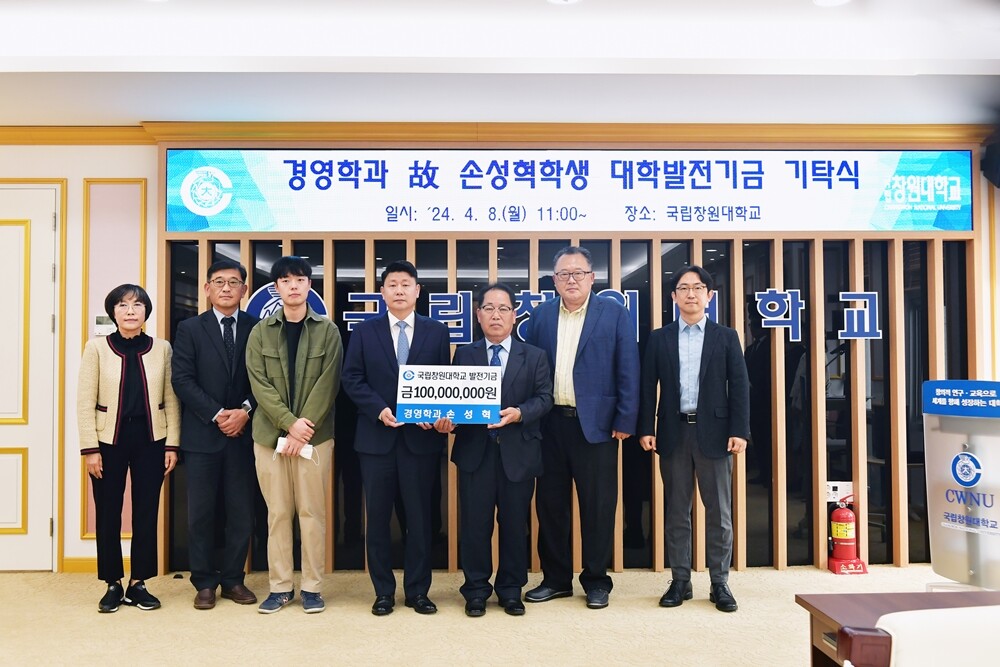 국립창원대학교는 8일 대학본부 5층 접견실에서 ‘고(故) 손성혁 학생 부모님 대학발전기금 1억 원 기탁식’을 개최했다.