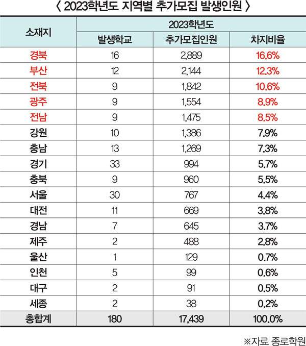우선 지역별로 보면 추가모집 인원이 제일 많은 지역은 경북으로 2889명이다. 이어 부산 2144명, 전북 1842명, 광주 1554명, 전남 1475명 순이다. 이들 5개 지역의 전체 추가모집 인원은 9904명으로 전체 추가모집의 56.8%에 달한다.