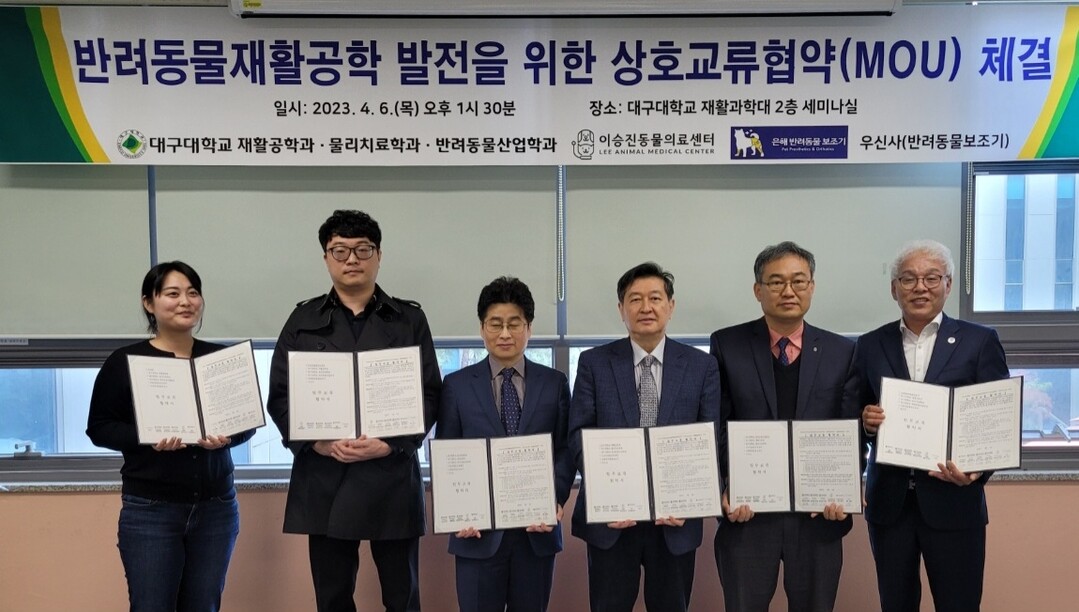 [대학저널 온종림 기자] 대구대학교는 6일 재활공학과와 물리치료학과, 반려동물산업학과 3개 학과가 이승진동물의료센터, 은해반려동물보조기, 우신사 등과 반려동물재활공학 발전을 위한 상호 업무협약을 체결했다고 밝혔다.