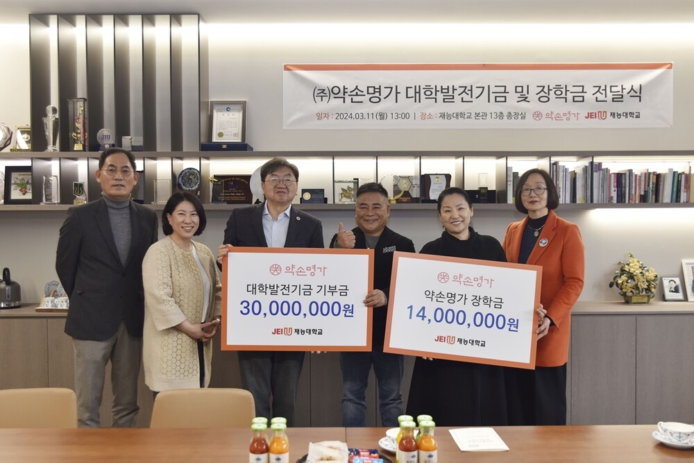 [대학저널 온종림 기자] ㈜약손명가가 재능대학교에 대학발전기금과 장학금 등 4,400만원을 기탁했다.