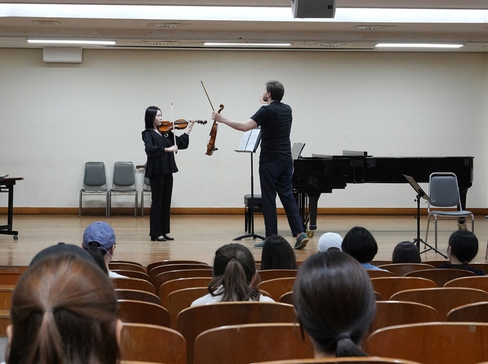 베를린 필하모닉 오케스트라 바이올리니스트 도리안 조지(Dorian Xhoxhi)가 성신여대 재학생을 대상으로 마스터클래스를 진행하고 있다. 사진=성신여대 제공 |