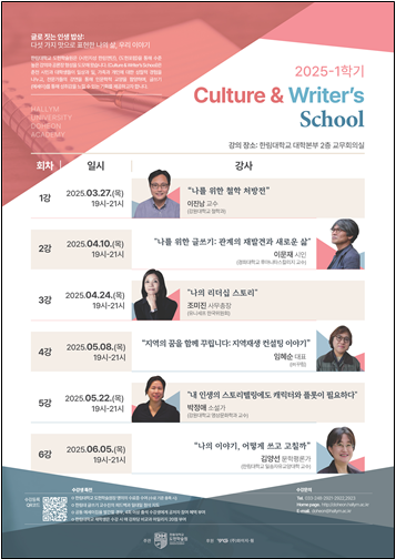 2025년 1학기〈Culture & Writer’s School〉에는 이진남 교수에 이어 이문재 시인(경희대 후마니타스칼리지 교수), 조미진 유니세프 한국위원회 사무총장, ㈜꾸림의 임혜순 대표, 박정애 소설가(강원대 영상문화학과 교수), 김양선 문학평론가(한림대 일송자유교양대학 교수)가 연사로 나설 예정이다.