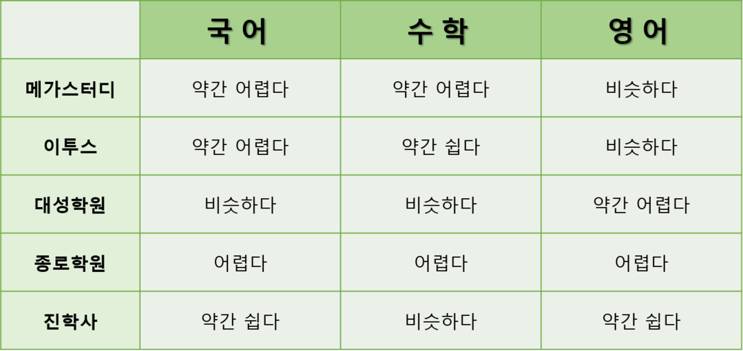 시험 난이도 평가는 입시 전문기관 ▲메가스터디 ▲이투스 ▲대성학원 ▲종로학원 ▲진학사에서 이루어진다.