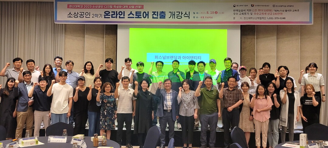 ‘2023년 2학기 온라인 스토어 진출 개강식 및 오리엔테이션’ 참석자들이 기념사진을 찍고 있다. 사진=한신대 제공 |