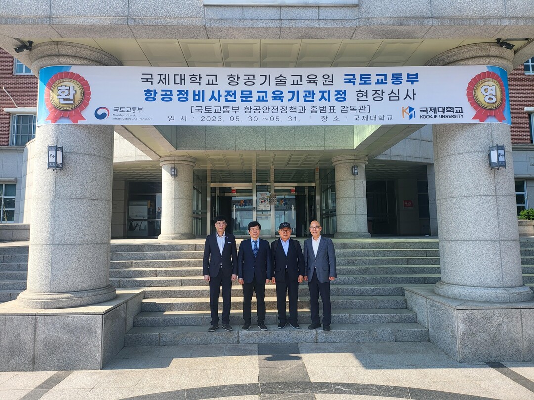 | 국제대 관계자들이 지난달 30일 항공기술교육원의 국토교통부 항공정비사전문교육기관지정 현장심사를 받은 뒤 포즈를 취하고 있다 있다. 사진=국제대 제공 |