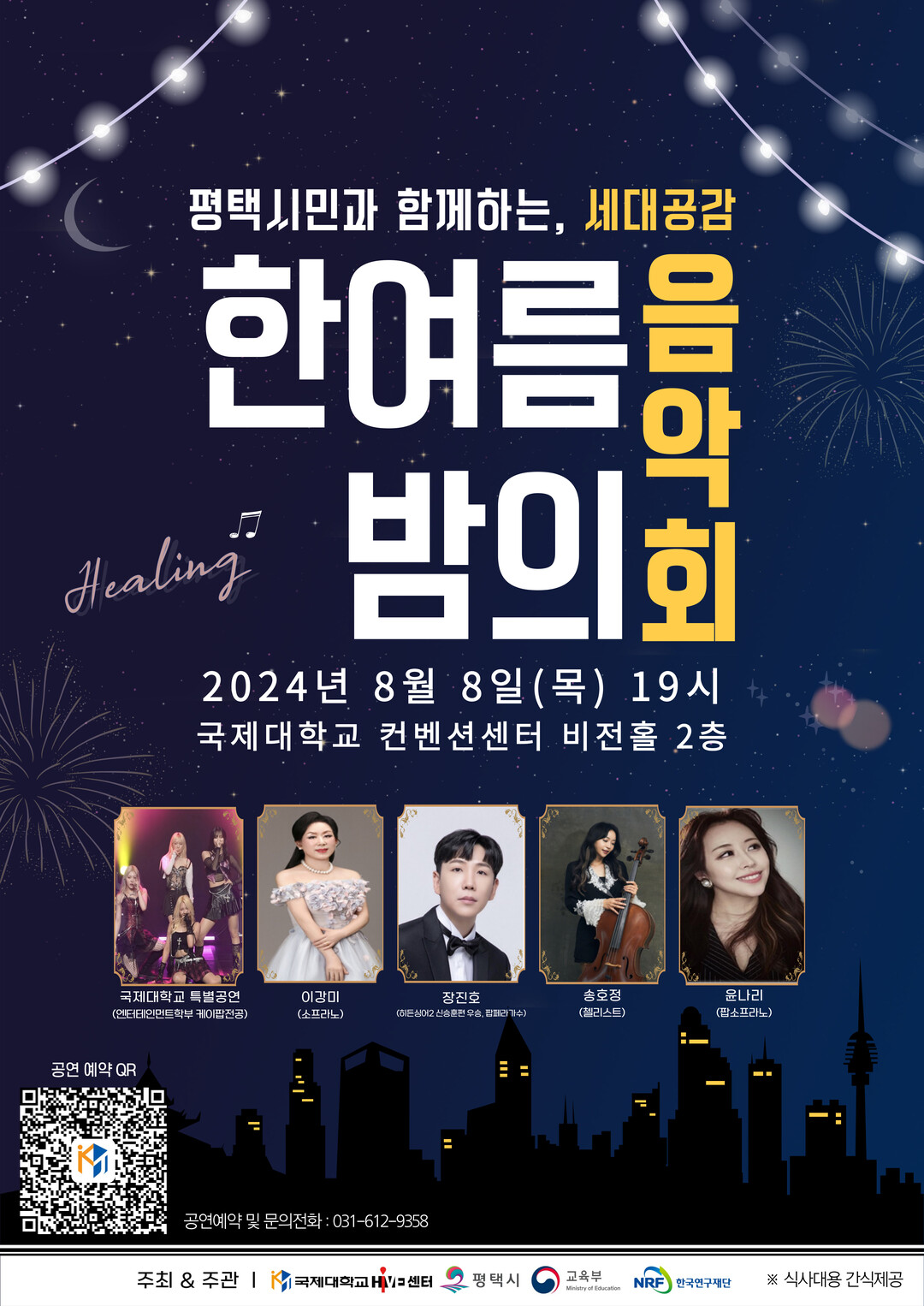 음악회는 8월 8일 오후 7시 국제대 컨벤션센터 비전홀 2층에서 열린다. 이번 음악회에는 다양한 장르의 음악을 즐길 수 있는 다채로운 출연진이 함께한다. 공연에는 소프라노 이강미, 팝페라 가수 장진호, 팝소프라노 윤나리, 첼리스트 송호정이 참여하며, 국제대학교 엔터테인먼트학부 케이팝 전공 학생들이 특별 공연을 준비하여 더욱 풍성한 무대를 선사할 예정이다.