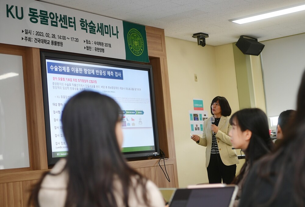 지난 2월 28일 개최된 KU동물암센터 학술세미나에서 윤경아 암센터장이 발표하고 있다. |