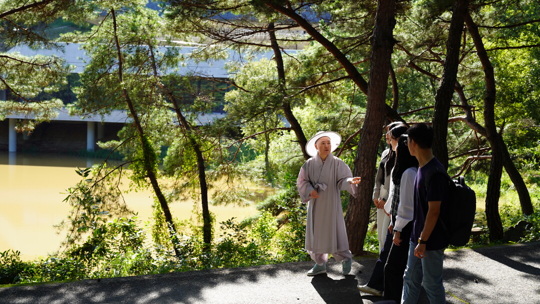 범우스님과 학생들이 선센터 산책길 마음걷기 도중 대화를 나누고 있다. 사진=동국대 제공 |