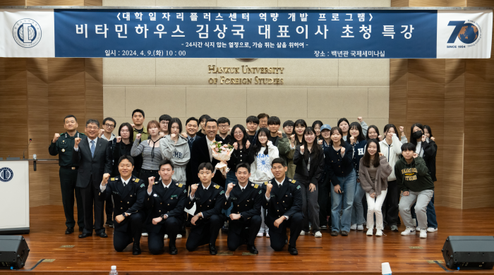 [대학저널 온종림 기자] 한국외국어대학교 글로벌캠퍼스 학생·인재개발처 대학일자리플러스본부 진로취업지원센터는 9일 비타민하우스 김상국 대표이사를 초청해 ‘24시간 식지 않는 열정으로, 가슴 뛰는 삶을 위하여’라는 주제로 특강을 개최했다.