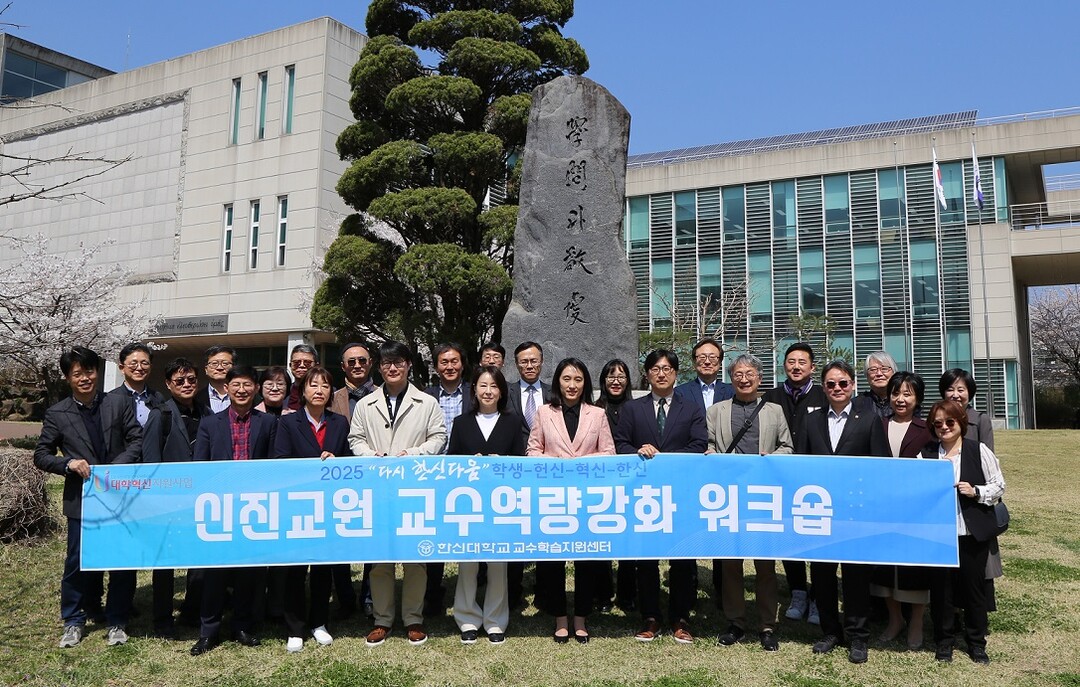 2025 신진교원 역량강화 워크숍 참석자들이 기념촬영을 하고 있다. 사진=한신대 제공 |