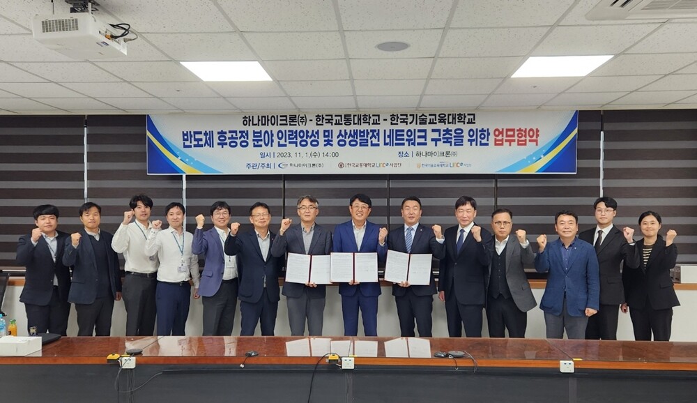 [대학저널 온종림 기자] 한국기술교육대학교 LINC 3.0사업단은 1일 하나마이크론(주), 한국교통대와 ‘충청지역 우수 인재 발굴과 반도체 후공정 분야 전문인력 양성’을 골자로 하는 업무협약을 체결했다.
